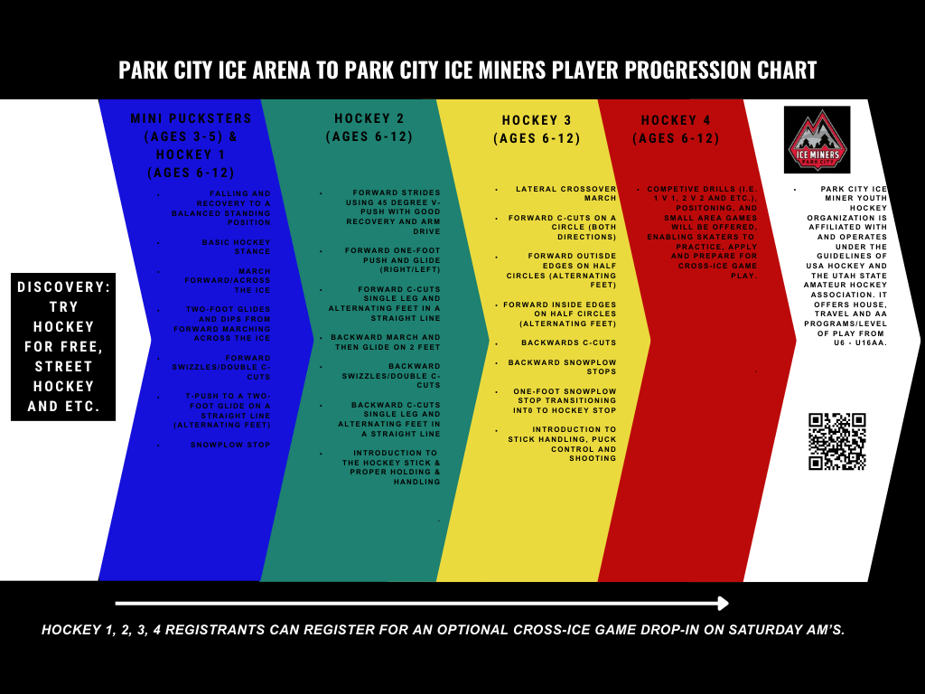 The first change is that we will be implementing a designated practice day for each player. Each player will register for a specific night of the week for their player to be on ice, this season, either Tuesday or Thursday. This will help us control the number of players on the ice at one time so that each player is receiving time and attention from our coaches. The second change will be that each “new to hockey’ player will first complete the Park City Ice Arena’s level 4 of Learn-to-Play before joining the Ice Miners. The PCIA offers Learn-to-Play levels 1-4, outlined in the attached document. If a player is exceptionally skilled at the start of their hockey journey, or skips levels in the Learn-to-Play program, he or she may be evaluated to join the Ice Miners sooner.